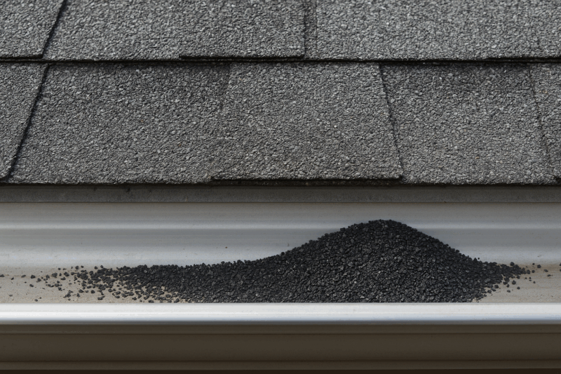 Homeowners often notice the aftermath in the gutters or at the base of downspouts. If you see black or gray sediment piled up, those are likely granules that washed off during the storm. Even if the roof surface looks mostly intact, that loss is an early warning sign.