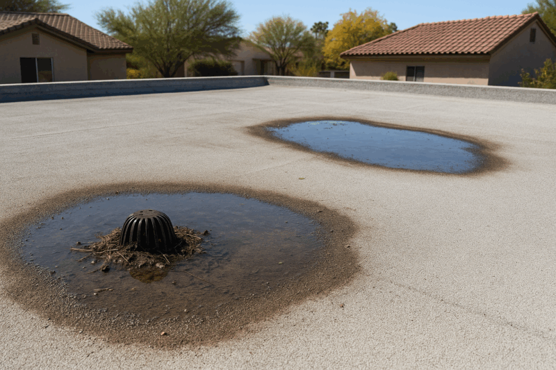 Monsoons overwhelm gutters, scuppers, and drains with dust, mud, and leaves. On pitched roofs, this leads to overflowing gutters. On flat roofs, the result can be pooling water, known as ponding. The water may evaporate after the storm, but it leaves behind dirty rings or residue that show where it sat.
